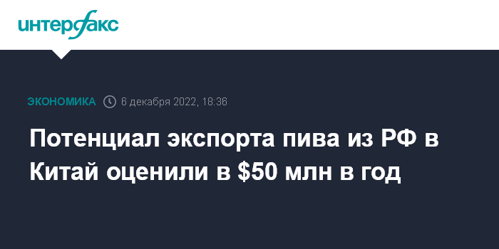 Москва. 6 декабря. INTERFAX.RU - Расчетный потенциал поставок пива из России в Китай оценивается на уровне $50 млн в год, сообщается в обзоре центра "Агроэкспорт" при Минсельхозе.