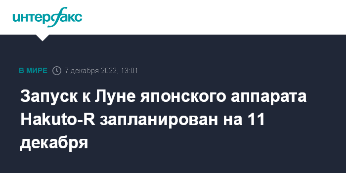 Москва. 7 декабря. INTERFAX.RU - Первый японский лунный посадочный аппарат Hakuto-R стартует к естественному спутнику Земли 11 декабря, сообщила в среду компания-разработчик ispace.