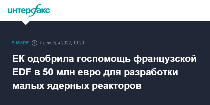 "Европейская комиссия в соответствии с правилами государственной помощи ЕС разрешила французскую госпомощь в размере 50 млн евро для поддержки проекта исследований и разработки малых ядерных реакторов", - говорится в коммюнике ЕК, опубликованном в среду в Брюсселе.