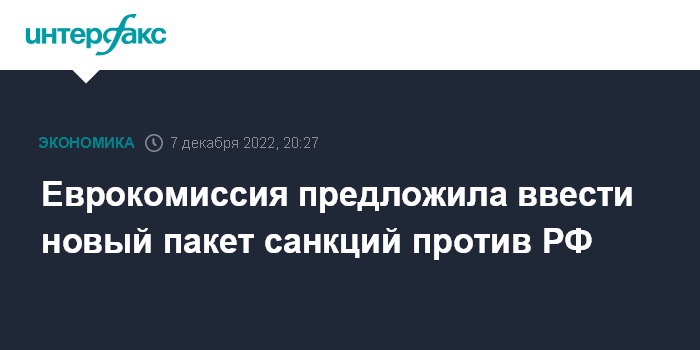 Москва. 7 декабря. INTERFAX.RU - Еврокомиссия в среду предложила ввести очередной - девятый - пакет санкций против России, который должен предусматривать запрет на транзакции с тремя российскими банками и другие меры.