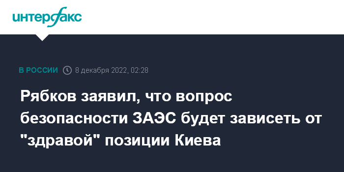 Москва. 8 декабря. INTERFAX.RU - Замглавы МИД РФ Сергей Рябков заявил, что нахождение компромисса по безопасности Запорожской АЭС (ЗАЭС) станет невозможным, если при решении вопроса по отношению к Москве возобладают "калькуляции иного свойства".