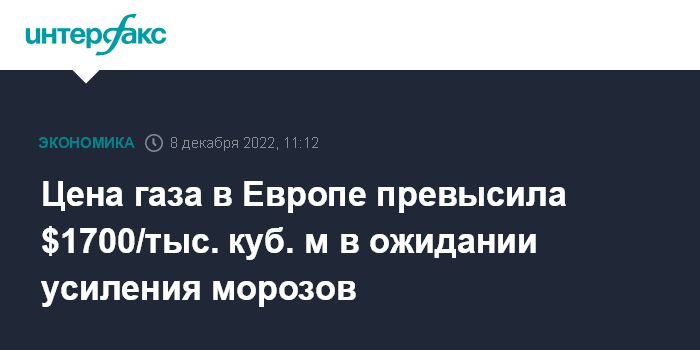 Москва. 8 декабря. INTERFAX.RU - Цена газа в Европе превысила $1700 за тысячу кубометров на ожиданиях дальнейшего понижения температуры воздуха в регионе.