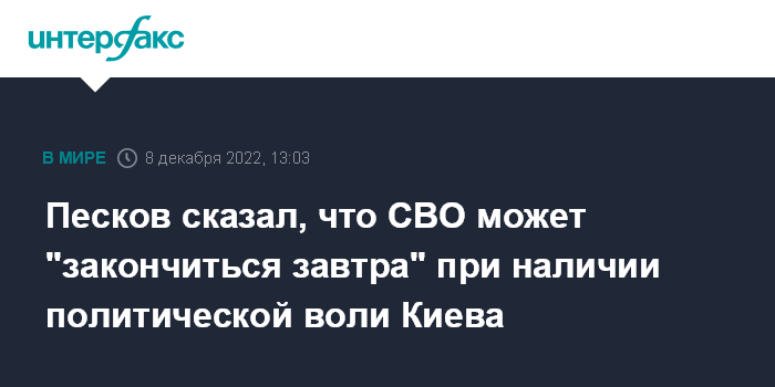 Песков сказал, что СВО может "закончиться завтра" при наличии политической воли Киева