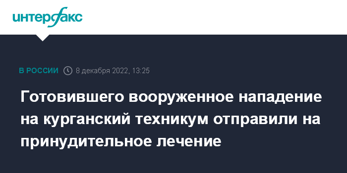 Москва. 8 декабря. INTERFAX.RU - Центральный окружной военный суд отправил на принудительное лечение студента Курганского техникума сервиса и технологий, которого обвиняли в подготовке нападения на учебное заведение, сообщается в материалах суда.