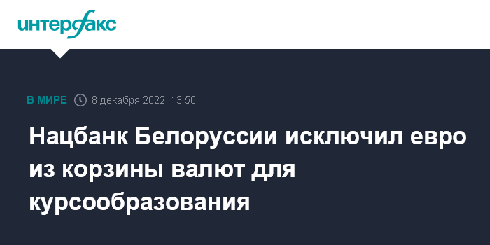 Москва. 8 декабря. INTERFAX.RU - Национальный банк Белоруссии (НББ) с 12 декабря исключит евро из корзины иностранных валют, применяемой для курсообразования, а также увеличит долю российского рубля в корзине с 50% до 60%, сообщила пресс-служба регулятора.