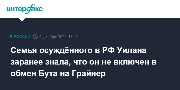 Москва. 8 декабря. INTERFAX.RU - Брат осуждённого в России за шпионаж американца Пола Уилана заявил, что власти США заранее предупредили их семью, что Уилан не будет включён в новый обмен заключёнными между РФ и Америкой.