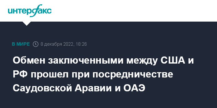 Москва. 8 декабря. INTERFAX.RU - Власти Саудовской Аравии и ОАЭ выступили посредниками между США и Россией при обмене американской баскетболистки Бриттни Грайнер на российского бизнесмена Виктора Бута, сообщает в четверг агентство EFE.