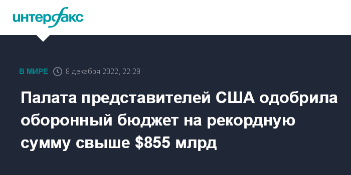 Москва. 8 декабря. INTERFAX.RU - Палата представителей Конгресса США в четверг приняла оборонный бюджет на 2023 финансовый год на беспрецедентную сумму в размере $858 млрд, сообщает Defense news.