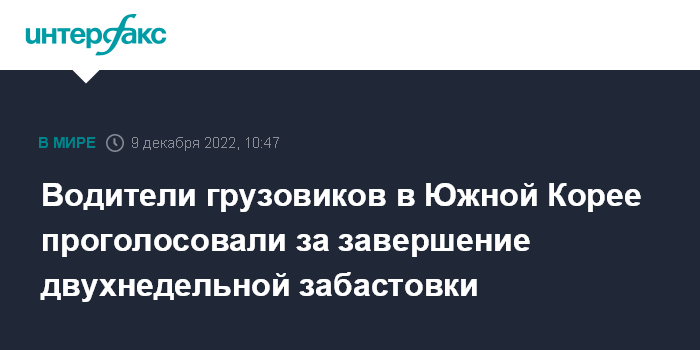 Москва. 9 декабря. INTERFAX.RU - Водители грузовиков в Южной Корее проголосовали за завершение забастовки, начавшейся 24 ноября и вызвавшей перебои в поставках в ключевых секторах экономики страны.