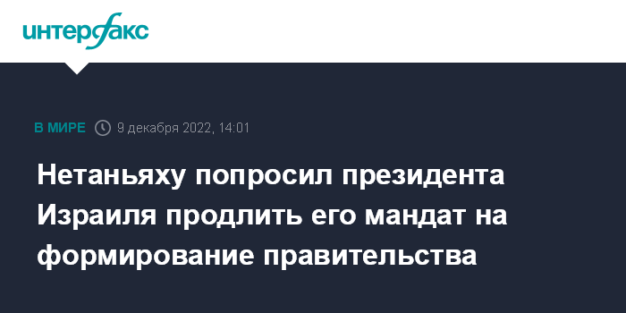 Москва. 9 декабря. INTERFAX.RU - Кандидат на пост премьера Израиля Биньямин Нетаньяху направил письмо президенту страны Исхаку Герцогу с просьбой продлить на 14 дней срок действия мандата на формирование правительства, пишет в пятницу газета Yedioth Ahronoth.