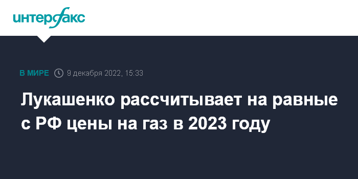 Москва. 9 декабря. INTERFAX.RU - Белоруссия рассчитывает в 2023 году на равные с Россией цены на газ, заявил белорусский президент Александр Лукашенко.