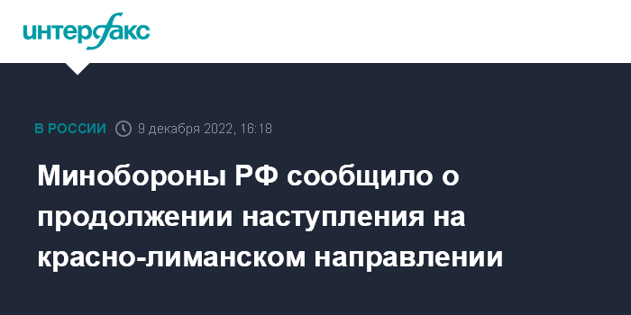 Москва. 9 декабря. INTERFAX.RU - Минобороны РФ заявило о продолжении наступления российской армии на красно-лиманском направлении и отражении украинских контратак.