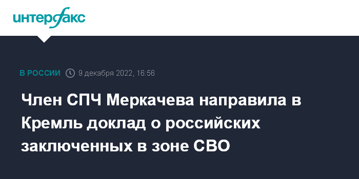 Москва. 9 декабря. INTERFAX.RU - Член Совета по правам человека (СПЧ), бывшая член ОНК Москвы Ева Меркачева направила в администрацию президента доклад по итогам полученных обращений об отправке российских осужденных из колоний в зону проведения СВО для участия в боевых действиях.