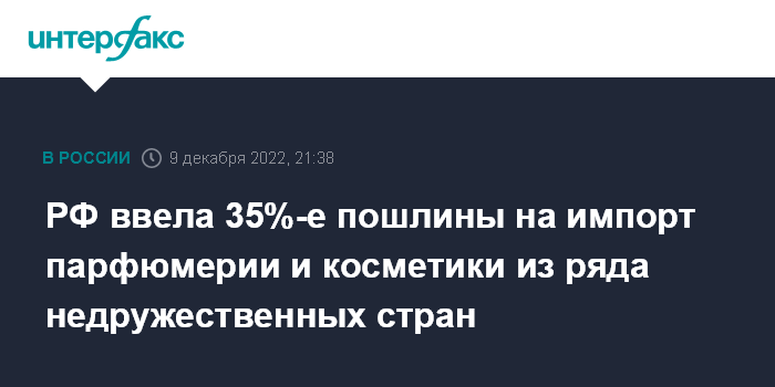 РФ ввела 35%-е пошлины на импорт парфюмерии и косметики из ряда недружественных стран