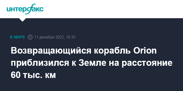 Москва. 11 декабря. INTERFAX.RU - Тестовый беспилотный американский космический корабль Orion в рамках завершения лунной миссии Artemis 1 ("Артемида-1") уже находится на расстоянии около 60 тыс. км от Земли, сообщило НАСА.