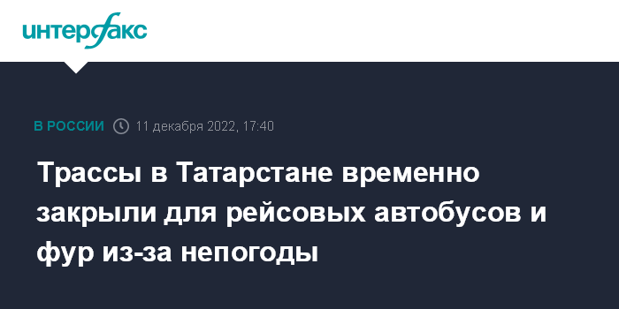 Москва. 11 декабря. INTERFAX.RU - Непогода стала причиной временного закрытия движения по федеральным автодорогам для рейсовых автобусов и грузовиков в Татарстане, сообщает в воскресенье пресс-служба "Волго-Вятскуправтодора".