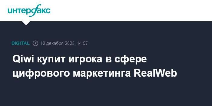 Москва. 12 декабря. INTERFAX.RU - Qiwi plc заключила соглашение о приобретении 78% игрока в сфере цифрового маркетинга RealWeb, говорится в сообщении группы.