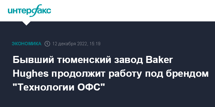 Москва. 12 декабря. INTERFAX.RU - Тюменский завод нефтепромыслового оборудования, ранее принадлежавший международной компании Baker Hughes, продолжит работу под брендом "Технологии ОФС", сообщила пресс-служба губернатора Тюменской области Александра Моора.