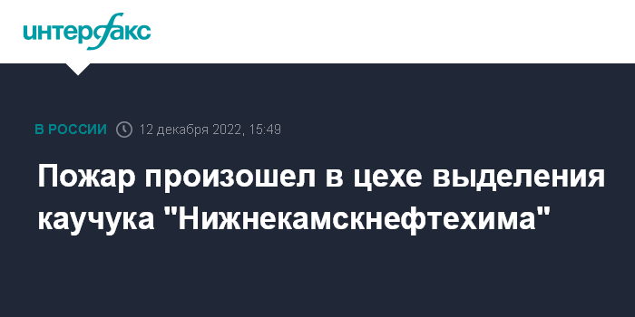 Москва. 12 декабря. INTERFAX.RU - В цехе выделения каучука ПАО "Нижнекамскнефтехим" днем в понедельник произошел пожар, никто не пострадал, сообщила пресс-служба предприятия.
