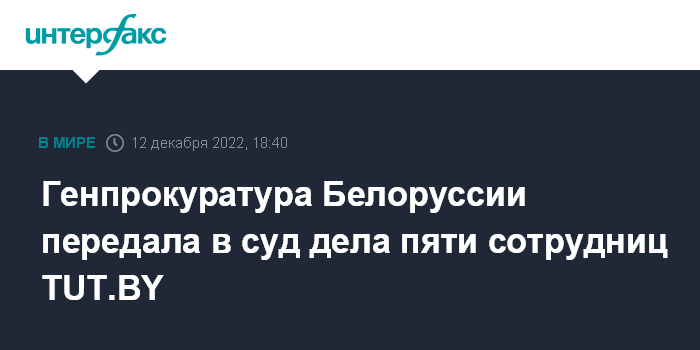 Москва. 12 декабря. INTERFAX.RU - Генпрокуратура Белоруссии передала в суд поступившие от Следственного комитета уголовные была пяти сотрудниц некогда крупнейшего в стране новостного портала TUT.BY (ООО "ТУТ БАЙ МЕДИА") Людмилы Чекиной, Марины Золотовой, Ольги Лойко, Елены Толкачевой, Екатерины Ткаченко и иных лиц.