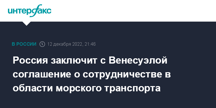 Москва. 12 декабря. INTERFAX.RU - Россия планирует подписать соглашение о сотрудничестве в области морского транспорта с Венесуэлой, следует из распоряжения от 10 декабря за подписью премьер-министра Михаила Мишустина. Документ опубликован на официальном портале правовой информации.
