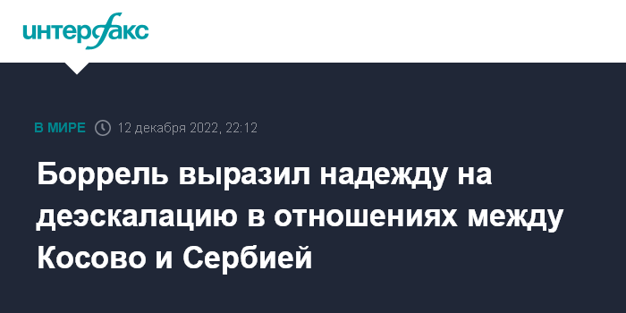 Москва. 12 декабря. INTERFAX.RU - Высокий представитель Евросоюза по иностранным делам Жозеп Боррель высказал обеспокоенность Совета ЕС развитием ситуации в Косово, где, по его оценке возник риск роста напряженности, и призвал стороны избегать насилия и провокаций.