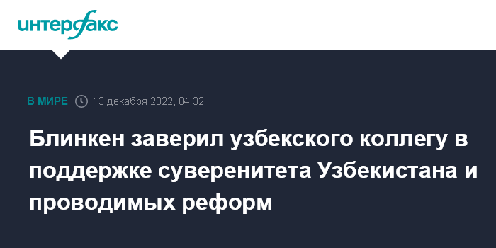 Москва. 13 декабря. INTERFAX.RU - Госсекретарь США Энтони Блинкен на встрече с главой узбекского МИД Владимиром Норовым заявил, что Соединенные Штаты всемерно поддерживают независимость и суверенитет Узбекистана, а также приветствовал проводимые в стране реформы, сообщил американский Госдепартамент.