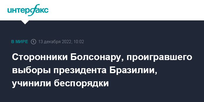 Москва. 13 декабря. INTERFAX.RU - Беспорядки с участием сторонников проигравшего выборы президента Бразилии Жаира Болсонару произошли в ночь на вторник в бразильской столице, сообщает медиахолдинг Globo.