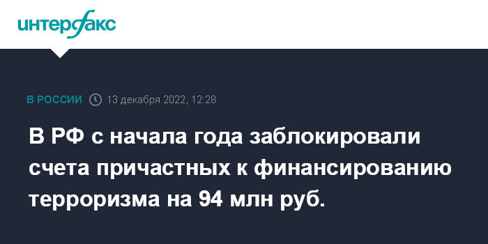 В РФ с начала года заблокировали счета причастных к финансированию терроризма на 94 млн руб.