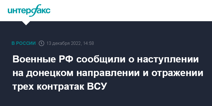 Москва. 13 декабря. INTERFAX.RU - Российские военные продолжают наступление на донецком направлении, отражая контратаки вооруженных сил Украины (ВСУ), сообщил официальный представитель Минобороны РФ Игорь Конашенков.
