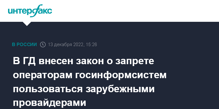 Москва. 13 декабря. INTERFAX.RU - В Госдуму внесён проект закона о запрете для операторов информационных систем государственных органов и бюджетных организаций пользоваться зарубежными провайдерами.