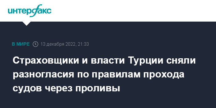 В конце ноября Анкара объявила, что проходящие по проливам танкеры, причем не только с российской нефтью, должны будут предоставить письма от страховых компаний, гарантирующие страховое покрытие в турецких водах. Такие меры Анкара приняла в связи с решением G7, ЕС и Австралии разрешать страховать суда, перевозящие российскую нефть, только в том случае, если нефть на борту покупается по цене $60 за баррель или ниже.