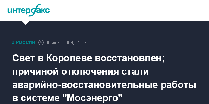 Москва. 30 июня. ИНТЕРФАКС - Причиной отключения электроэнергии в Королеве стали аварийно-восстановительные работы в системе "Мосэнерго". В настоящее время ситуация в городе стабилизировалась.