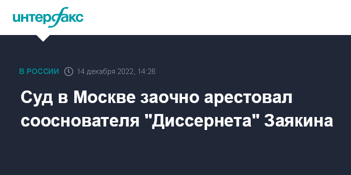 Москва. 14 декабря. INTERFAX.RU - Басманный суд Москвы по ходатайству следствия заочно арестовал сооснователя сообщества "Диссернет" Андрея Заякина (признан в РФ физлицом-иноагентом), обвиняемого в финансировании экстремистской деятельности, сообщили "Интерфаксу" в пресс-службе суда.