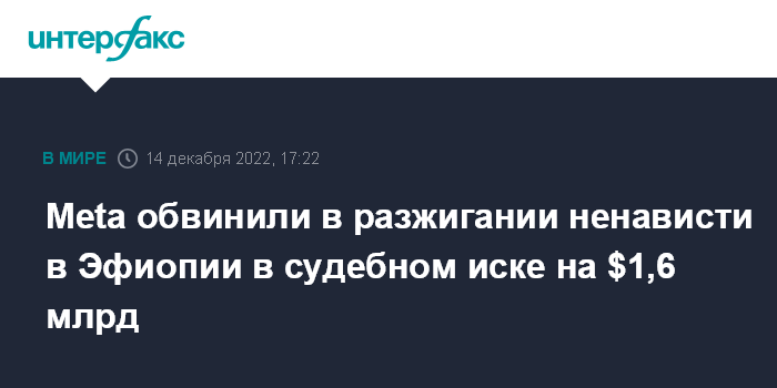 Москва. 14 декабря. INTERFAX.RU - Американскую Meta Platforms (признана в РФ экстремистской организацией и запрещена) обвинили в разжигании ненависти и подстрекательстве к насилию в Эфиопии.