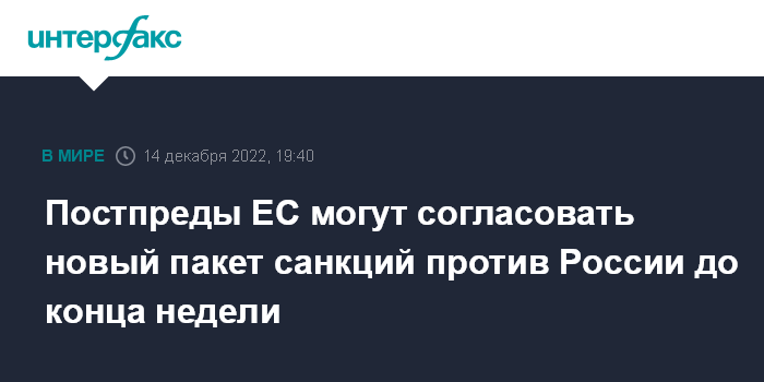 Москва. 14 декабря. INTERFAX.RU - Постпреды стран ЕС в среду не смогли завершить согласование девятого пакета санкций против России, они могут сделать это до конца недели, пишет итальянская газета "Соле 24 - Оре" со ссылкой на европейский дипломатический источник.