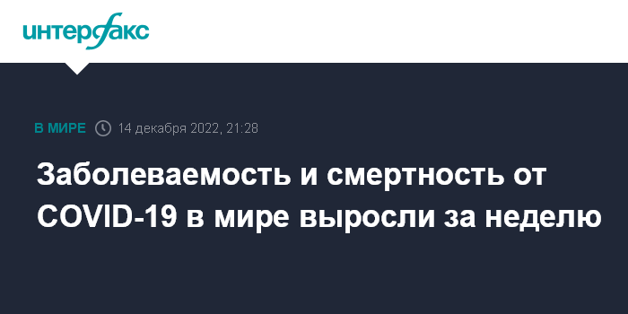 Москва. 14 декабря. INTERFAX.RU - Заболеваемость коронавирусом COVID-19 в мире за неделю выросла на 2%, смертность - на 10%, говорится в еженедельном эпидемиологическом бюллетене Всемирной организации здравоохранения (ВОЗ).