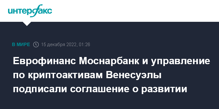 Москва. 15 декабря. INTERFAX.RU - Российско-венесуэльский Еврофинанс Моснарбанк заключил соглашение о цифровом развитии с Главным национальным управлением по криптоактивам и связанной с ними деятельностью (Sunacrip) Боливарианской республики Венесуэла, передает корреспондент "Интерфакса" с подписания в рамках межправкомиссии России и Венесуэлы.