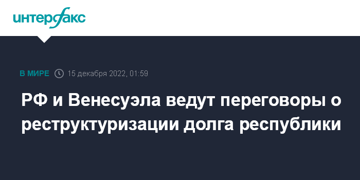 Москва. 15 декабря. INTERFAX.RU - Переговоры о реструктуризации долга республики ведут Россия и Венесуэла, сообщил "Интерфаксу" директор департамента государственного долга и государственных финансовых активов министерства финансов РФ Петр Казакевич.