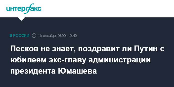 Москва. 15 декабря. INTERFAX.RU - Пресс-секретарю президента РФ Дмитрию Пескову неизвестно, будет ли глава государства поздравлять экс-руководителя администрации президента Валентина Юмашева с 65-летием.