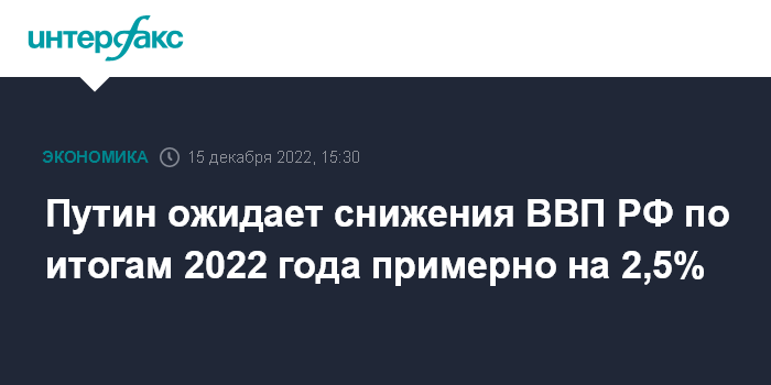 Москва. 15 декабря. INTERFAX.RU - Снижение ВВП РФ в 2022 году может оказаться меньше, чем ожидалось еще недавно, и составить порядка 2,5%, заявил президент России Владимир Путин на заседании Совета по стратегическому развитию и национальным проектам.
