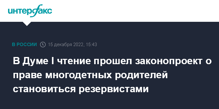 Москва. 15 декабря. INTERFAX.RU - Законопроект, предоставляющий родителям трех и более детей возможность поступить в мобилизационный резерв, принят Госдумой РФ в первом чтении.