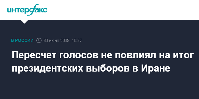 Москва. 30 июня. INTERFAX.RU - Частичный пересчет голосов, проведенный Советом стражей конституции Ирана, никак не повлиял на окончательные результаты президентских выборов, сообщил во вторник иранский телеканал "Пресс ТВ".