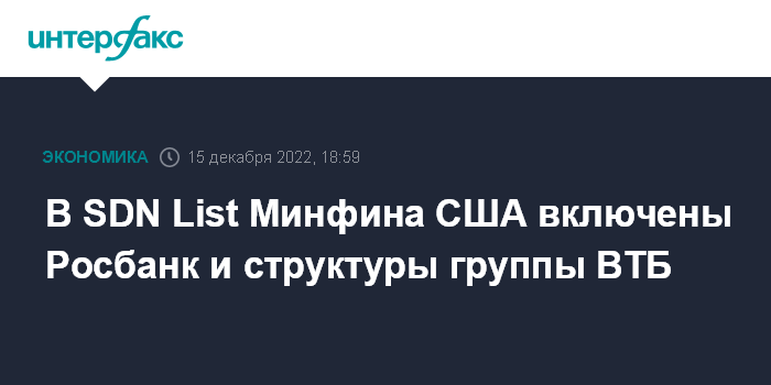Москва. 15 декабря. INTERFAX.RU - Минфин США включил в SDN List Росбанк, сообщил администратор санкционного списка OFAC.
