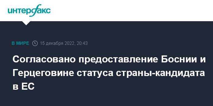 Москва. 15 декабря. INTERFAX.RU - Лидеры стран Евросоюза согласовали решение предоставить Боснии и Герцеговине статус страны-кандидата на вступление в союз, сообщил в соцсетях пресс-секретарь председателя Евросовета Баренд Лейтс.