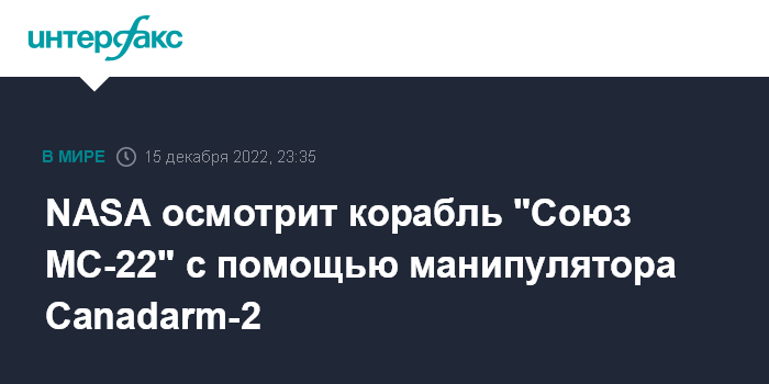 Москва. 15 декабря. INTERFAX.RU - Национальное управление США по аэронавтике и исследованию космического пространства (NASA) сообщило о планах осмотреть российский корабль "Союз МС-22", на котором в четверг была обнаружена утечка в системе охлаждения, с помощью роботизированной руки-манипулятора Canadarm-2.