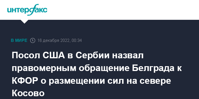 Посол США в Сербии назвал правомерным обращение Белграда к КФОР о размещении сил на севере Косово