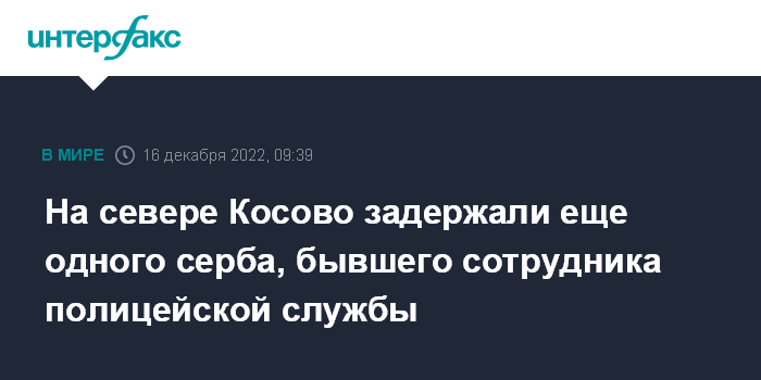 Москва. 16 декабря. INTERFAX.RU - Еще один бывший сотрудник косовской полиции сербской национальности Сладжан Трайкович задержан в ночь на пятницу в северной части города Косовска-Митровица, сообщает сербский телерадиоканал РТС.