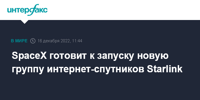 Москва. 16 декабря. INTERFAX.RU - Ракета-носитель Falcon 9 в воскресенье по московскому времени стартует на орбиту с очередной партией из 54 мини-спутников для пополнения орбитальной группировки глобальной сети интернет-покрытия системы Starlink, сообщила компания-разработчик SpaceX.