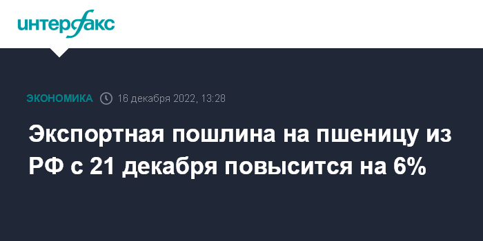 Экспортная пошлина на пшеницу из РФ с 21 декабря повысится на 6%